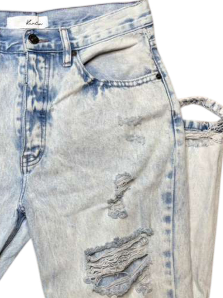 Experience effortless, edgy style with our Kancan ripped jeans in light denim. Featuring a flattering size 3 fit, these jeans add a touch of daring with their distressed details. Elevate your wardrobe with these versatile and chic jeans.